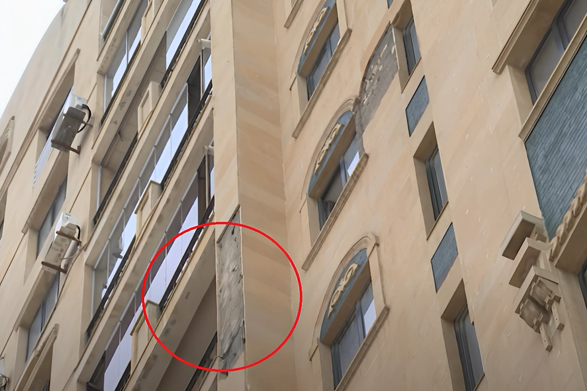 Paytaxtın Nəsimi rayonu, Həzi Aslanov küçəsində yerləşən çoxmərtəbəli binanın üzlük daşları qopub tökülür.