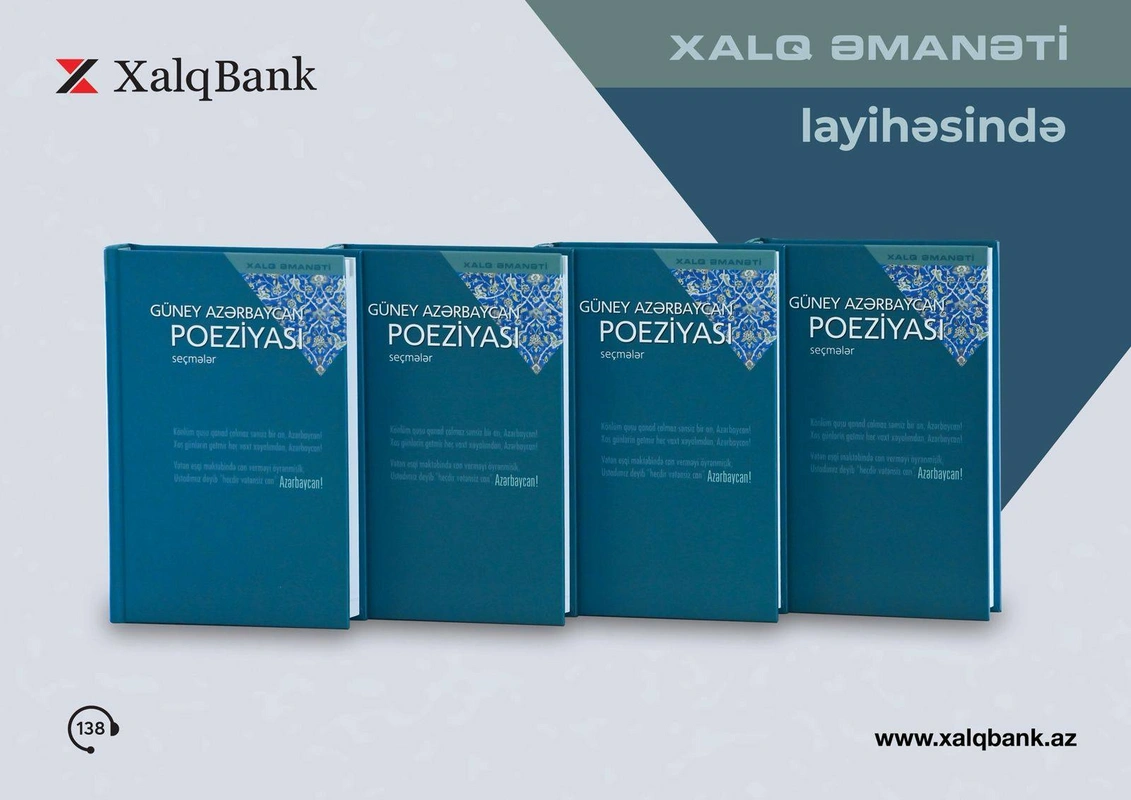 “Xalq Bank” “Xalq Əmanəti” layihəsi çərçivəsində 25-ci kitabını təqdim edir. Bu nəşr Cənubi Azərbaycan poeziyasına həsr olunub. Kitabda Güney Azərbaycanda doğulmuş, müxtəlif ədəbi təmayül və cərəyanları təmsil edən, XX əsrin əvvəllərindən günümüzə qədərki dövrdə yazıb-yaratmış 50 azərbaycanlı şairin fərqli mövzularda və janrlarda qələmə aldıqları seçmə şeir və poemaları, eləcə də qəzəlləri toplanıb. Müəlliflərin sırasında adını Azərbaycan ədəbiyyatı tarixinə yazmış böyük şairlərimizlə yanaşı, çağdaş dövrün istedadlı gənc ədiblərinin də isimləri vardır. XX-XXI əsrlər bütöv Azərbaycanın ədəbi mənzərəsini görmək üçün vasitə olaraq ərsəyə gələn “Güney Azərbaycan poeziyası. Seçmələr” kitabı həm də keşməkeşli tariximizi əks etdirir.