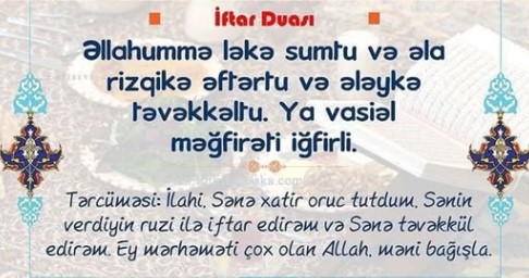 “İlahi, səndən ötrü oruc tutdum, sənin verdiyin ruzi ilə iftar açdım və sənə təvəkkül etdim. Bağışlayan və mehriban Allahın adı ilə. Ey hüdudsuz bağışlama sahibi, mənim günahlarımı bağışla!”