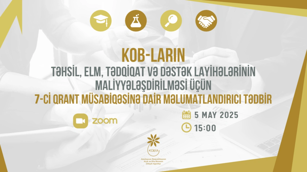 Mayın 5-də, saat 15:00-da Kiçik və Orta Biznesin İnkişafı Agentliyinin (KOBİA) təşkilatçılığı ilə KOB-ların təhsil, elm, tədqiqat və dəstək layihələrinin maliyyələşdirilməsinə dəstək üçün elan edilmiş yeddinci qrant müsabiqəsinə dair onlayn formatda məlumatlandırıcı tədbir keçiriləcək.